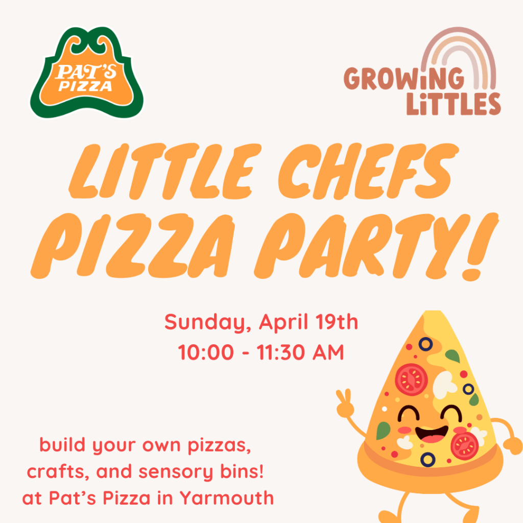 Join us at Pat’s Pizza in Yarmouth where kid chefs ages 1.5 – 7 years will get to make their own pizzas, tour the kitchen, enjoy pizza-themed crafts and activities, and of course, eat their pizzas together! Plus, grown-ups welcome to order off the menu. Pat’s is excellent at accommodating our allergies, please just reach out if needed!